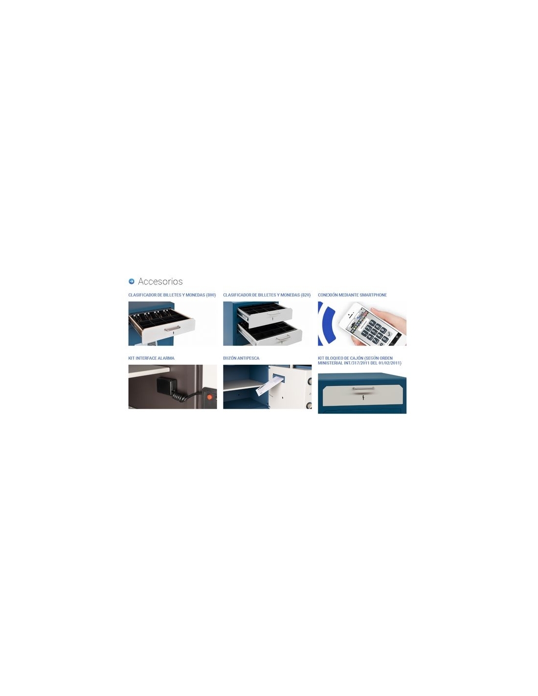 Submostrador antiatraco. Es la solución ideal para evitar los atracos en los establecimientos de venta al público. Dispone de un cajón con guías deslizantes, en cuya parte delantera incorpora una bandeja para la clasificación de billetes/monedas. 5 bulones de 20mm.Giratorios Fijación en base Buzón anti-pesca Luz interior Bandeja clasificador de monedas / billetes en cajón superior Cajón superior con cerradura de 7 gorjas y dolble paletón Color a elegir Ral 5009 o Ral 7035