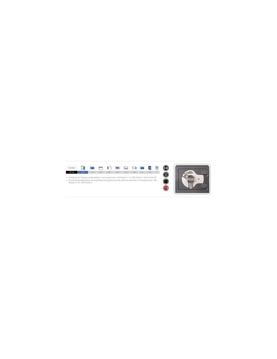 Serie de cajas fuertes de novedoso diseño y certificadas según norma UNE EN-1143 Grado Serie de cajas fuertes de novedoso diseño y certificadas según norma UNE EN-1143-1 Grado I. Perfectas para el domicilio o negocio. Algunos modelos cuentan con la opción de buzón antipesca en el frontal.Se ofrecen en 5 versiones distintas en cuanto a tipos de cierre.Puerta y marco de acero de 12 mm. de espesor. Blindaje anti-taladro. Bulones giratorios de Ø 25 mm. Sistemas de cierre.Combinación electrónica con posibilidad de apertura retardada. Homologaciones VdS Klasse 2 / EN 1300 Clase B Cerradura de 7 gorjas y doble paletón. Homologaciones : VdS Klasse / A1300 Classe A / a2p Niveau EA. Apertura por tirador. Características principales Cerradura homologada VdS Klasse 1 / A 1300 Clase A / a2p Buzón anti-pesca Posibilidad de programación de apertura retardada Procteción pasiva contra el fuego Estantes regulables en altura Blindaje anti-taladro Rebloqueo en caso de ataque Certificado según la norma UNE-1143-1 en Grado l