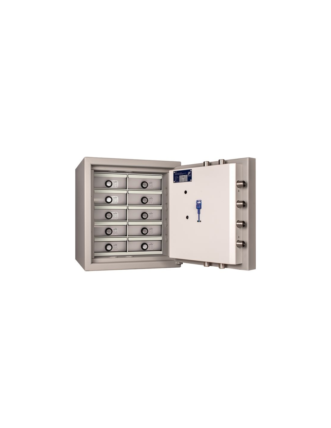 Prácticos compartimentos para cajas de las Series lll y lV . Totalmente configurables para todos los tamaños de cajas y dotados con cerradura numerada.Cerraduras numeradas. Sistemas de cierre.Cerradura de puntos reversible. Características principales Cajones numerados Posibilidad de amaestramiento de llaves Dotados con cerradura numerada Prácticos compartimentos para cajas lll ylv Configurable para todos los tamaños de caja Número de columnas 2 Número de cajones 10